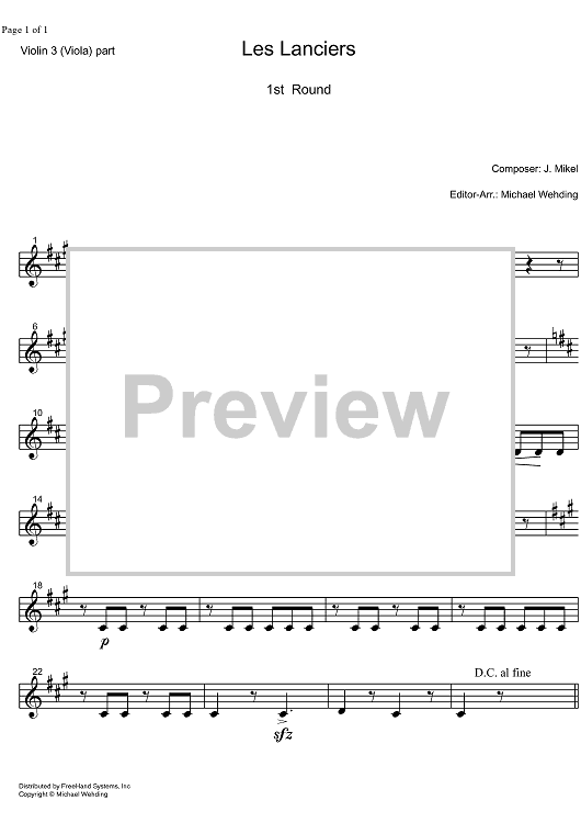 Digital Sheet Music for Les Lanciers 1st Round - Violin 3/Viola by J. Mikel, Michael Wehding scored for Orchestra; id:324151