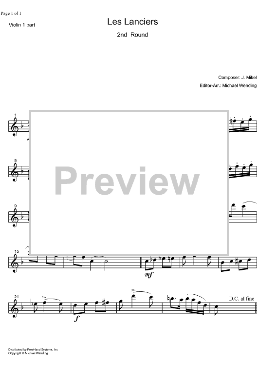 Digital Sheet Music for Les Lanciers 2nd Round - Violin 1 by J. Mikel, Michael Wehding scored for Orchestra; id:348048