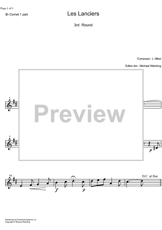 Digital Sheet Music for Les Lanciers 3rd Round - B-flat Cornet 1 by , J. Mikel, Michael Wehding scored for Orchestra; id:324196