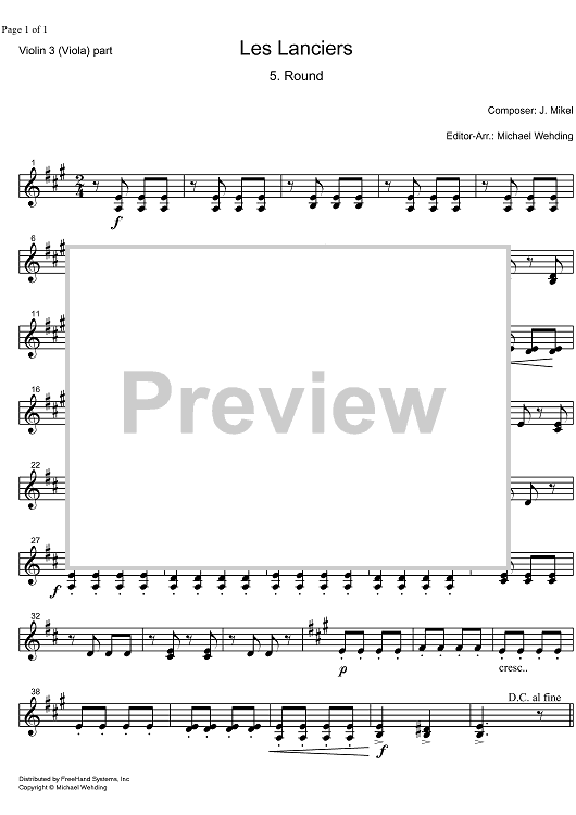 Digital Sheet Music for Les Lanciers 5th Round - Violin 3/Viola by J. Mikel, Michael Wehding scored for Orchestra; id:324269