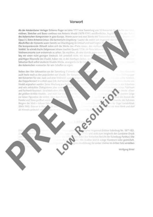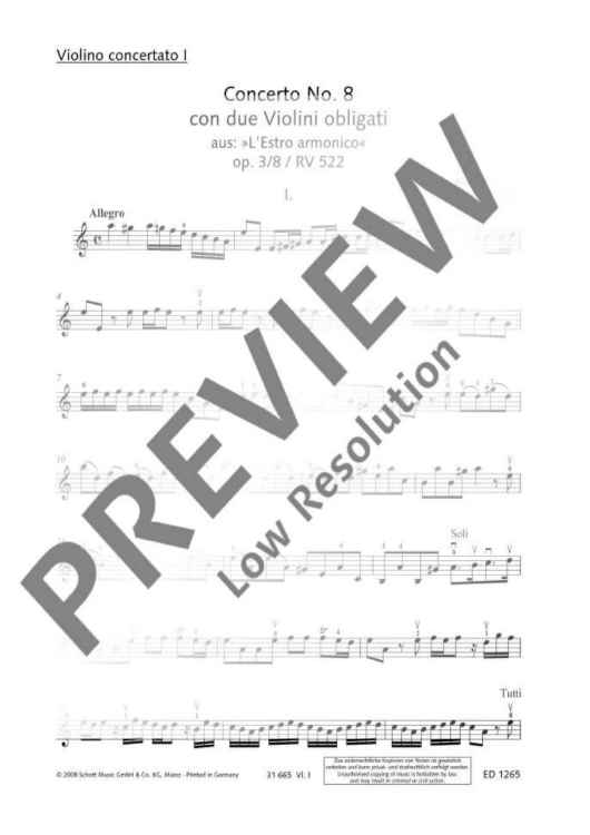 The 12 violin concertos Op. 3 L'Estro Armonico laid the foundations of Antonio Vivaldi's fame in the whole of Europe and are still among the most popular works by the Italian composer. The Double Concerto in A minor Op. 3/8 can certainly be regarded as one of the most mature and exciting concertos in Vivaldi's entire oeuvre: His mixture of cantability and delight in playing, his passionate concertising in the outer movements and his rapt dialogising over an ostinato bass in the Larghetto e spiritoso have always fascinated both the audience and the experts. The present publication is based on the critical new edition by Christopher Hogwood, containing the original versions of both violin parts and providing a piano score free of any Romantic overload.