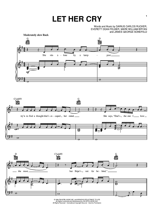 Digital Sheet Music for Let Her Cry by Hootie & the Blowfish, Jim Sonefeld, Darius Rucker, Dean Felber scored for Piano/Vocal/Chords; id:368336