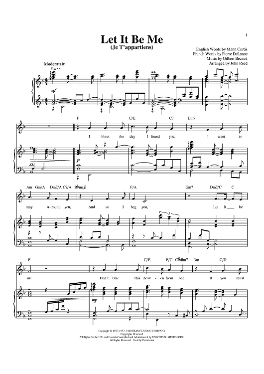 Digital Sheet Music for Let It Be Me (Je T'appartiens) by Mann Curtis, Elvis Presley, Gilbert Becaud, Pierre Delanoë, Slick Rick, The Everly Brothers scored for Piano/Vocal/Chords; id:396928