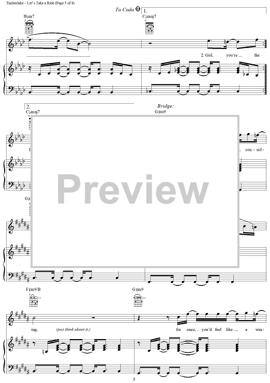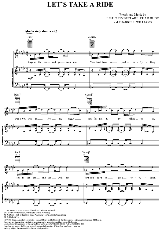 Digital Sheet Music for Let's Take a Ride by Chad Hugo, Pharrell Williams, Justin Timberlake scored for Piano/Vocal/Chords; id:296459
