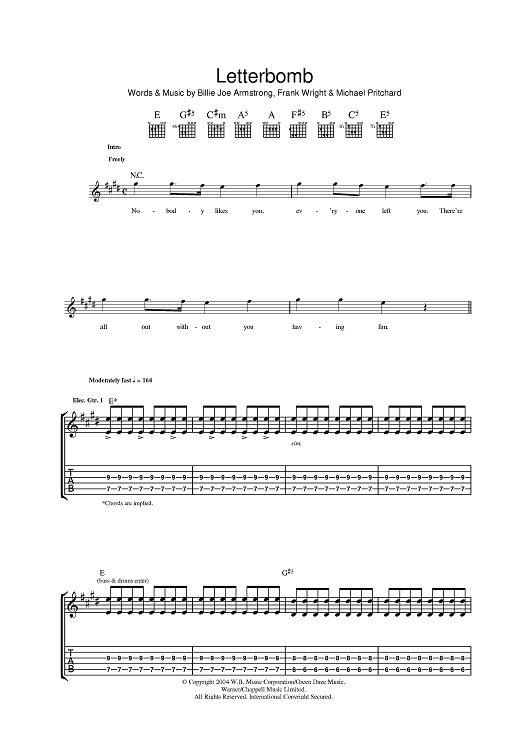 Digital Sheet Music for Letterbomb by Billie Joe Armstrong, Michael Pritchard, Frank Wright, Green Day scored for Guitar Tab; id:396376