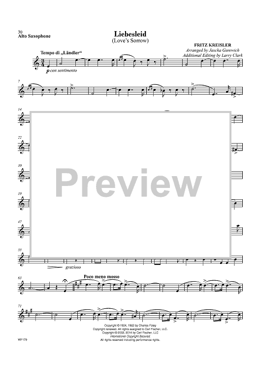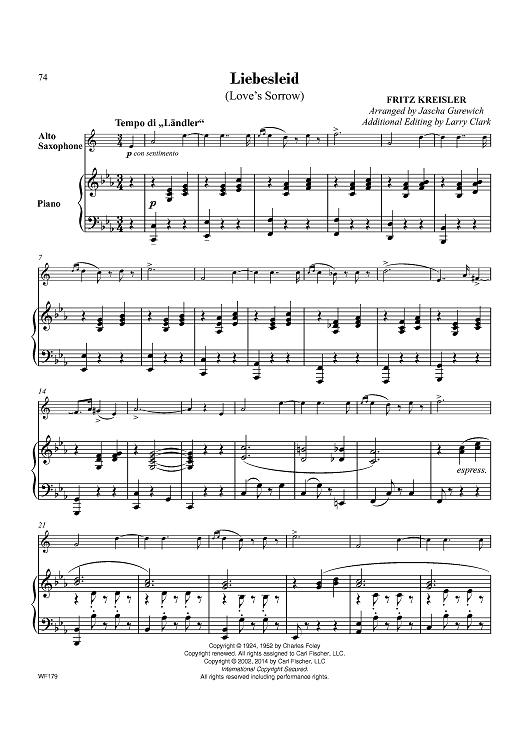 Digital Sheet Music for Liebesleid (Love’s Sorrow) by Fritz Kreisler, Jascha Gurewich scored for Eb Alto Sax/Piano; id:451692
