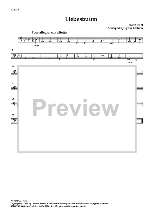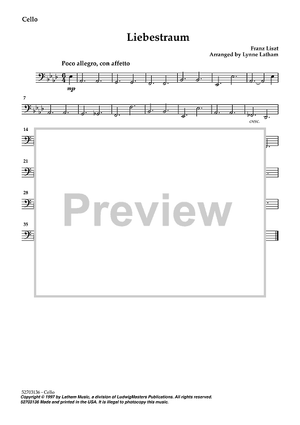 Digital Sheet Music for Liebestraum - Cello by , Franz Liszt, Lynne Latham scored for String Quartet; id:449717