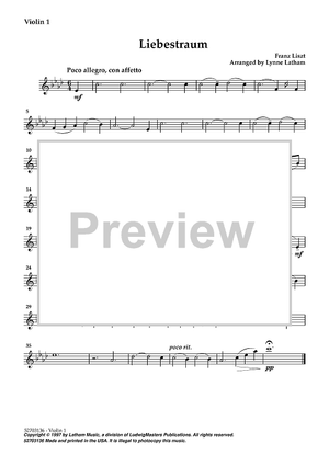Digital Sheet Music for Liebestraum - Violin 1 by , Franz Liszt, Lynne Latham scored for String Quartet; id:449714