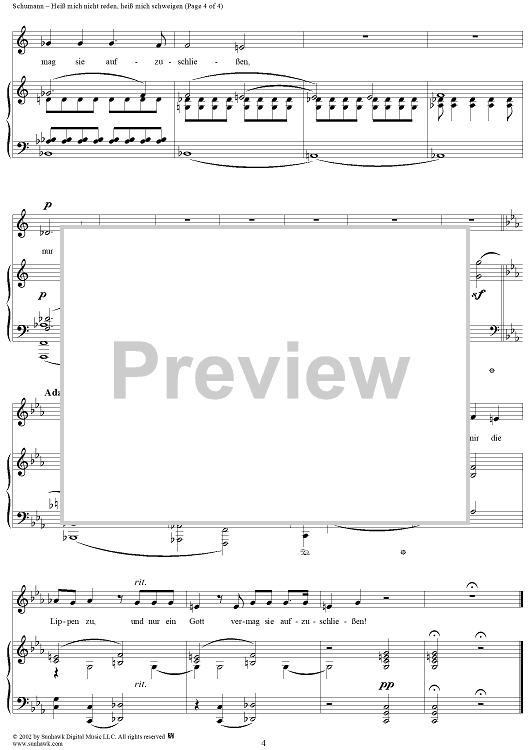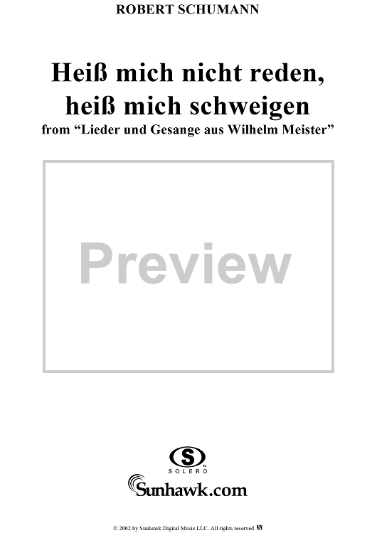 Digital Sheet Music for Lieder und Gesänge aus Wilhelm Meister, Op. 98a, No. 5 - Heiß mich nicht reden, heiß mich schweigen - No. 5 from "Lieder and Songs from Wilhelm Meister" op. 98a by Johann Wolfgang von Goethe, Robert Schumann scored for Voice/Piano; id:258623