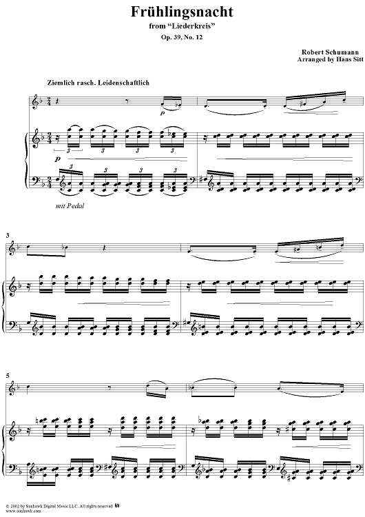 Digital Sheet Music for Liederkreis, Op. 39, No. 12, "Frühlingsnacht" (Spring night), - Piano by Hans Sitt, Robert Schumann scored for Violin/Piano; id:258113