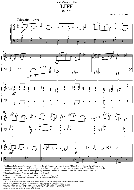 "Life" Sheet Music by Darius Milhaud