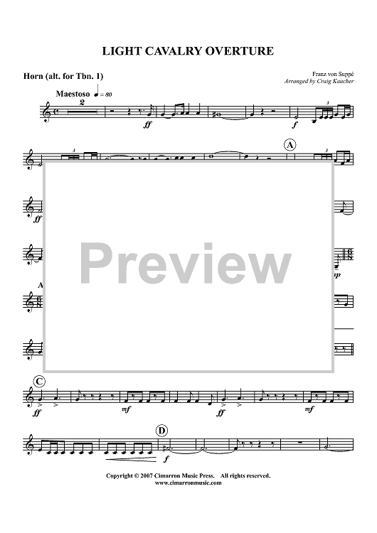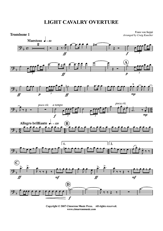 Digital Sheet Music for Light Cavalry Overture - Trombone 1 (opt. F Horn) by Franz Von Suppe, Craig Kaucher scored for Brass Quartet; id:413900