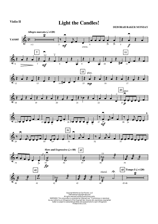 "Light the Candles! - Violin 2" Sheet Music by Deborah Baker Monday