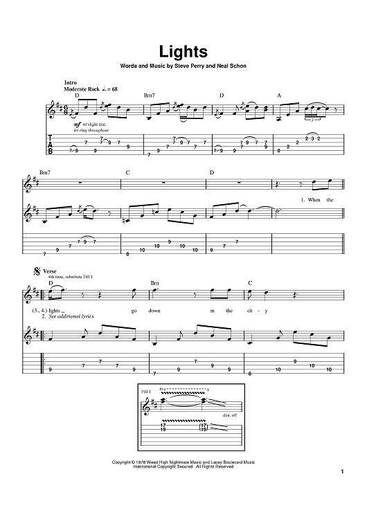 Digital Sheet Music for Lights by Steve Perry, Neal Schon, Journey scored for Guitar Tab; id:374177