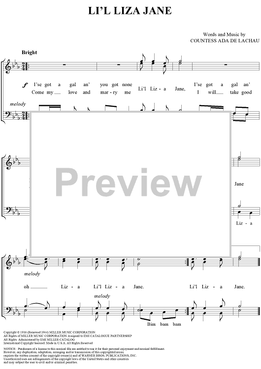 Digital Sheet Music for Li'l Liza Jane by Countess Ada De Lachau scored for Barbershop Quartet; id:250384