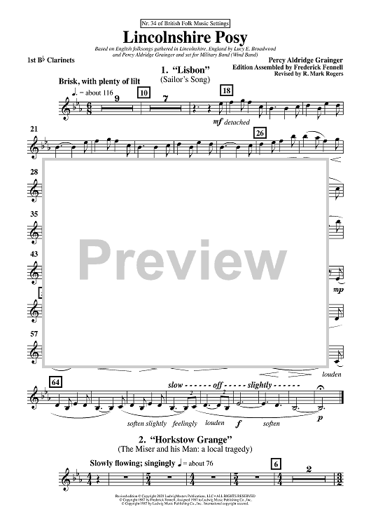 Digital Sheet Music for Lincolnshire Posy - 2020 Edition - Bb Clarinet 1 by Percy Grainger, Frederick Fennell scored for Concert Band; id:502620