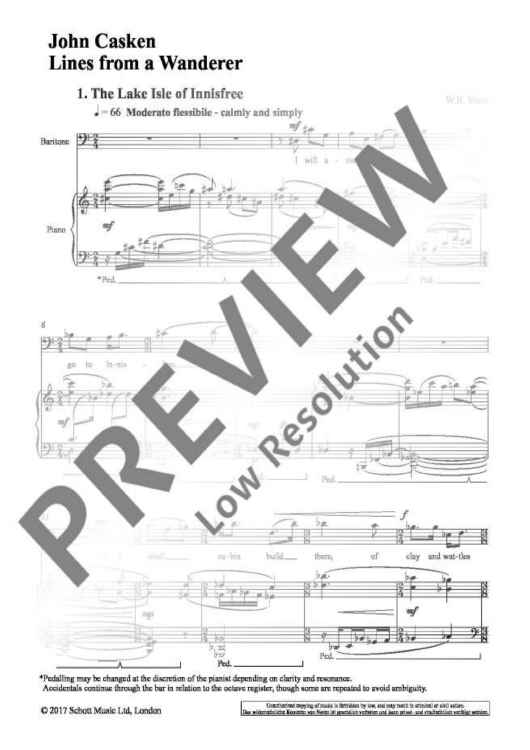 John Casken's 2009 setting of the Robert Browning poem 'Night and Morning' for tenor and piano was the starting point for a new song cycle, Lines from a Wanderer, exploring man’s desire to travel, to escape and be alone. This search for inner peace is contrasted with a deep nostalgia for places and people left behind in settings of two poems from W.B. Yeats, 'The Lake Isle of Innisfree' and 'The Song of Wandering Aengus', as well as Thomas Hardy's 'The Discovery' and Robert Browning's 'The Italian in England'.