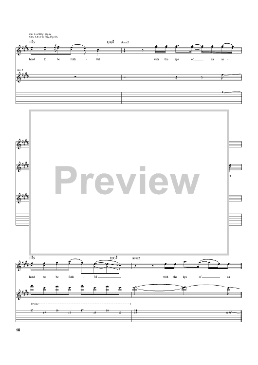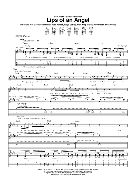 Digital Sheet Music for Lips Of An Angel by Brian Howes, Lloyd Garvey, Ross Hanson, Hinder, Mark King, Michael Rodden, Austin Winkler scored for Guitar Tab; id:394818