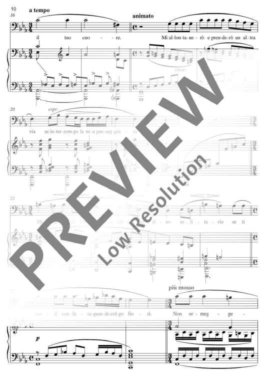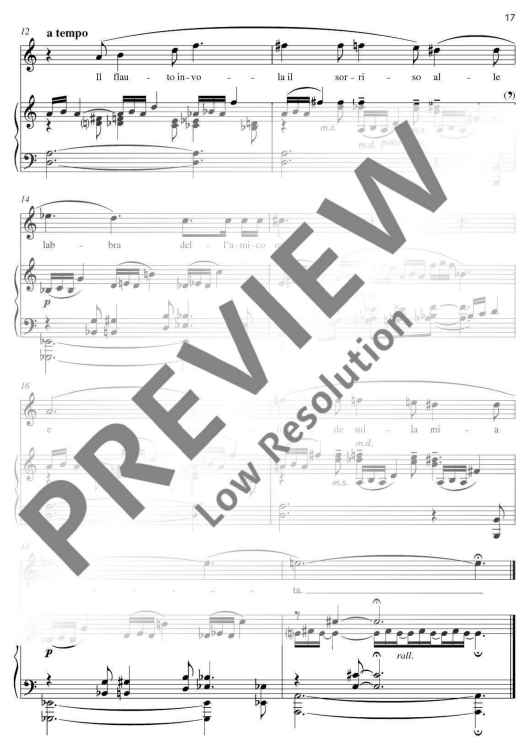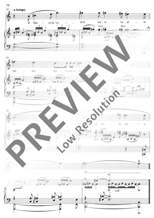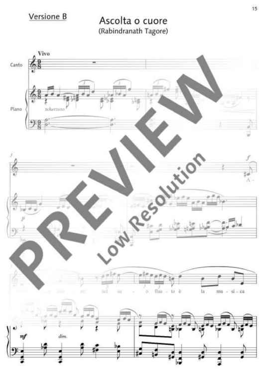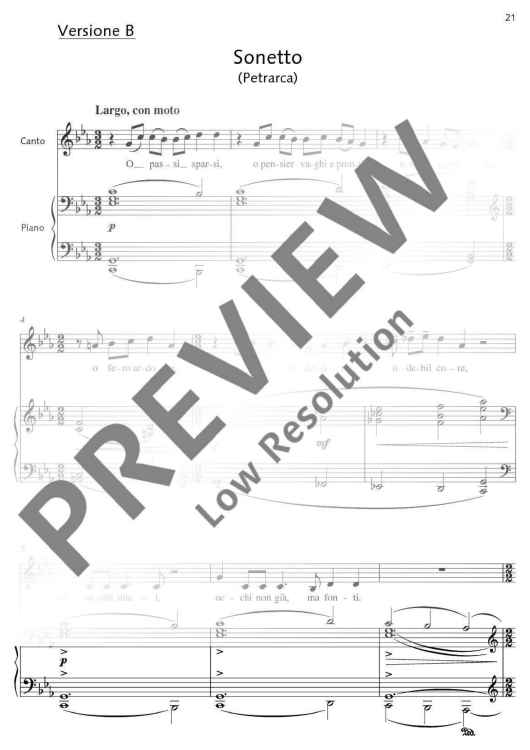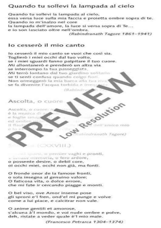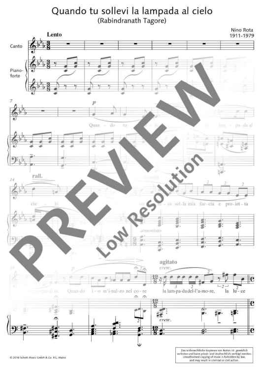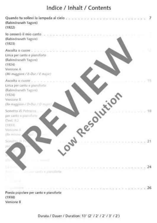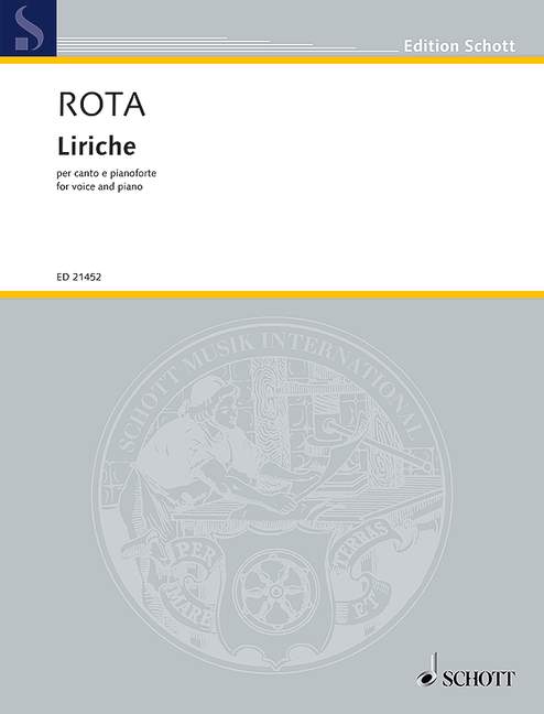 Between 1921 and 1938 Nino Rota composed twenty-one pieces for voice and piano, five of which he approved for printing. These early works made him known in the music world. The lyrics are of different origin: poems by the Indian Nobel Prize winner Tagore, a sonnet by Petrarch as well as a Tuscan folksong which was at the same time his last vocal chamber music work. Three of the songs contained in this new edition are printed in different keys, as can already be found in Rota's manuscripts.