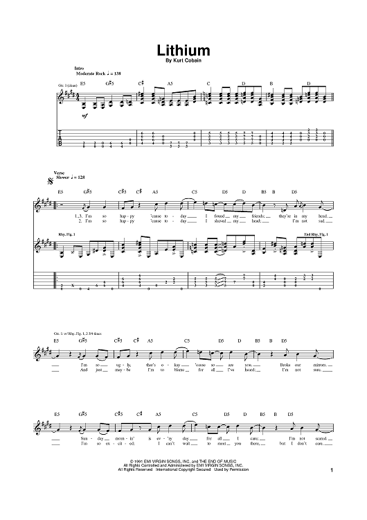 Digital Sheet Music for Lithium by Kurt Cobain, Nirvana scored for Guitar Tab; id:367891