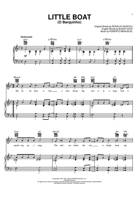 Digital Sheet Music for Little Boat by Buddy Kaye, Roberto Menescal, Ronaldo Boscoli scored for Piano/Vocal/Chords; id:384784