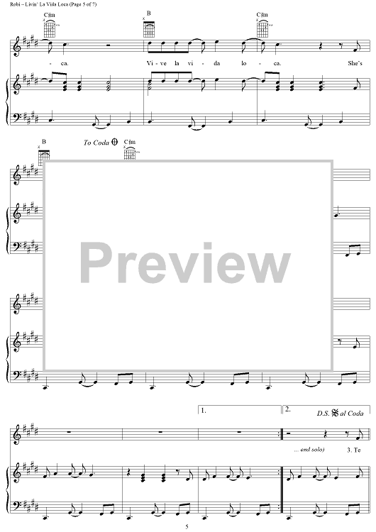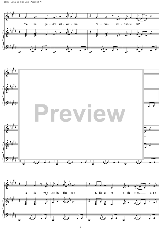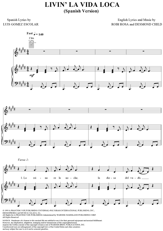 Digital Sheet Music for Livin' La Vida Loca (Spanish Version) by Desmond Child, Robi Rosa, Ricky Martin scored for Piano/Vocal/Chords; id:255849