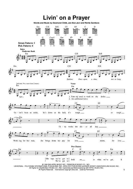 Digital Sheet Music for Livin' On A Prayer by Bon Jovi, Richie Sambora, Desmond Child, Jon Bon Jovi scored for Easy Guitar; id:370957
