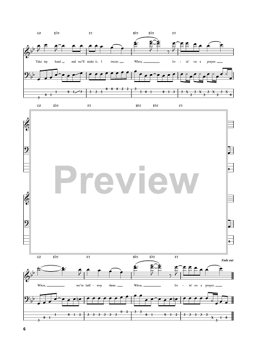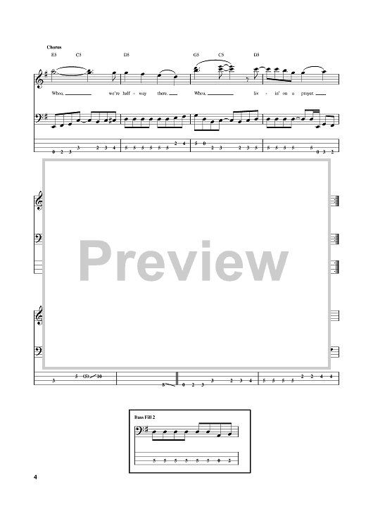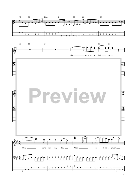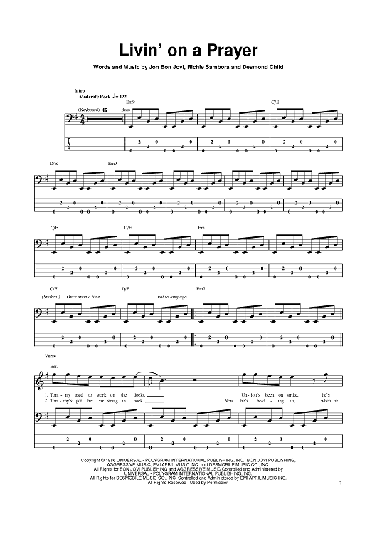Digital Sheet Music for Livin' On A Prayer by Bon Jovi, Richie Sambora, Desmond Child, Jon Bon Jovi scored for Bass Tab; id:382336