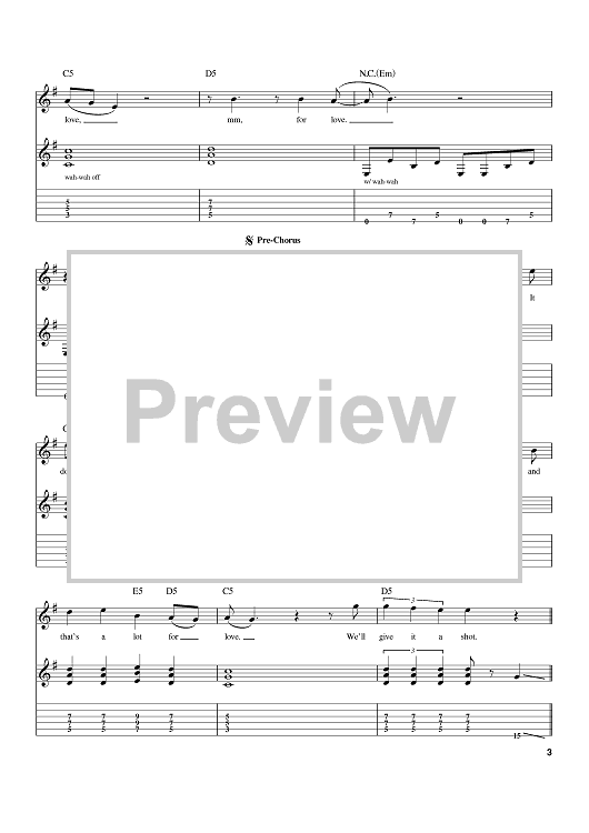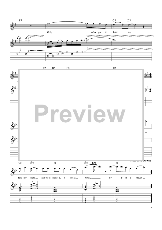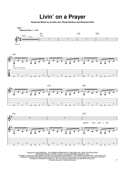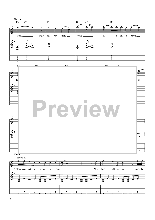 Digital Sheet Music for Livin' On A Prayer by Bon Jovi, Richie Sambora, Desmond Child, Jon Bon Jovi scored for Guitar Tab; id:386163