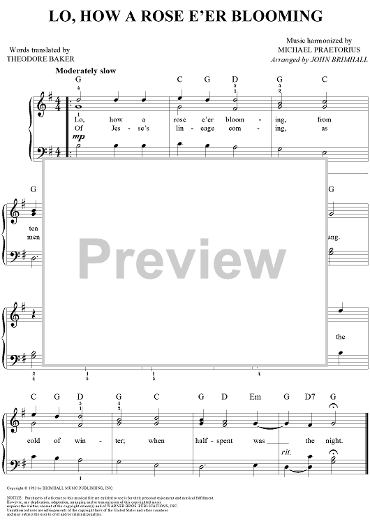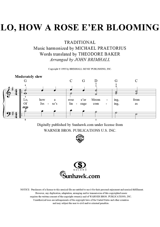 Digital Sheet Music for Lo, How A Rose E'er Blooming by Michael Praetorius, John Brimhall, Traditional scored for Easy Piano/Vocal; id:261356