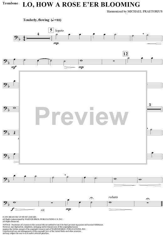 "Lo, How a Rose E'er Blooming - Trombone" Sheet Music by Michael Praetorius