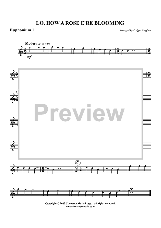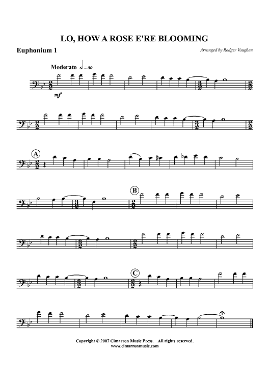 Digital Sheet Music for Lo, How a Rose E're Blooming - Euphonium 1 BC/TC by Rodger Vaughan, Traditional scored for Tuba Quartet; id:413598