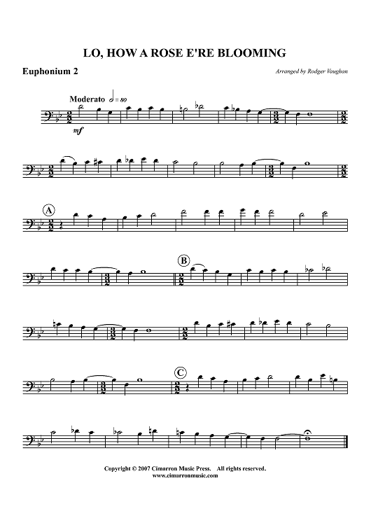 Digital Sheet Music for Lo, How a Rose E're Blooming - Euphonium 2 BC/TC by Rodger Vaughan, Traditional scored for Tuba Quartet; id:413599