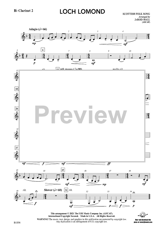 Digital Sheet Music for Loch Lomond - Bb Clarinet 2 by Scottish Folk Song, JaRod Hall scored for Concert Band; id:499666