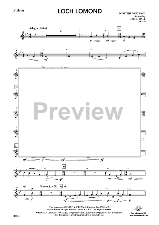 Digital Sheet Music for Loch Lomond - F Horn by Scottish Folk Song, JaRod Hall scored for Concert Band; id:499673