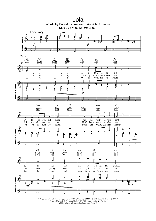 Digital Sheet Music for Lola by Frederick Hollander, Robert Leibmann scored for Piano/Vocal/Chords; id:382820