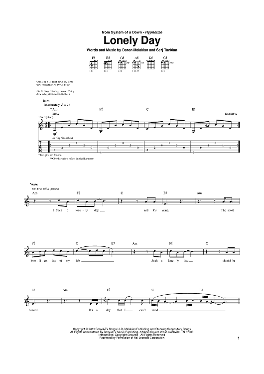 Digital Sheet Music for Lonely Day by Daron Malakian, System Of A Down, Serj Tankian scored for Guitar Tab; id:389429