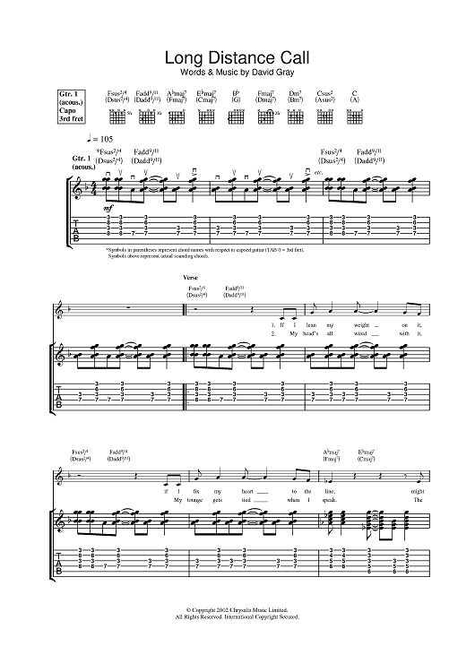 Digital Sheet Music for Long Distance Call by David Gray scored for Guitar Tab; id:377770