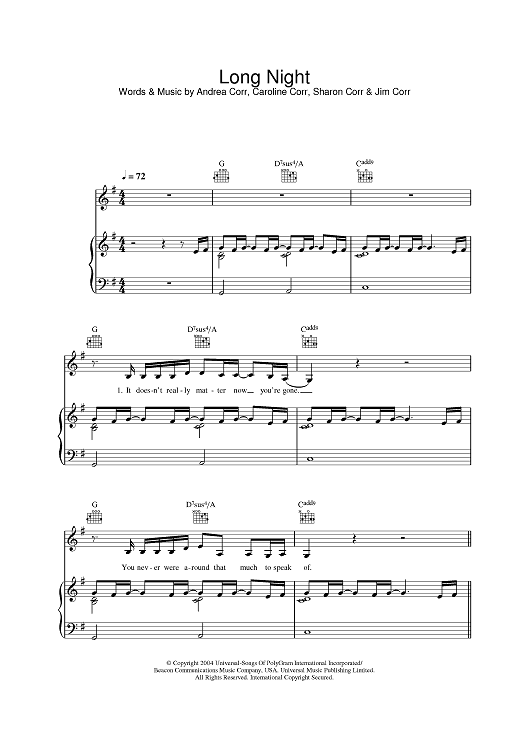 Digital Sheet Music for Long Night by The Corrs, Sharon Corr, Caroline Corr, Andrea Corr scored for Piano/Vocal/Chords; id:382923