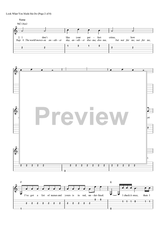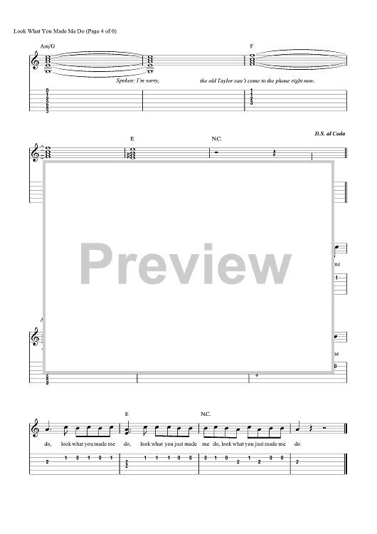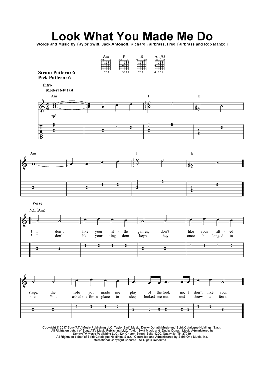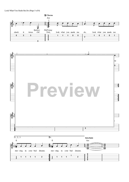 Digital Sheet Music for Look What You Made Me Do by Fred Fairbrass, Richard Fairbrass, Robert Manzoli, Taylor Swift, Jack Antonoff scored for Guitar Tab/Vocal/Chords; id:465626