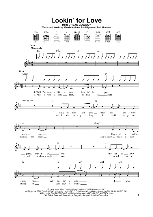 Digital Sheet Music for Lookin' For Love by Bob Morrison, Johnny Lee, Wanda Mallette, Patti Ryan scored for Easy Guitar; id:370366