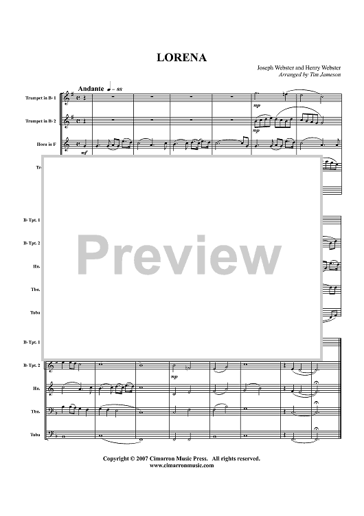 Digital Sheet Music for Lorena - Score by Joseph P. Webster, Tim Jameson, Henry Webster scored for Brass Quintet; id:417548