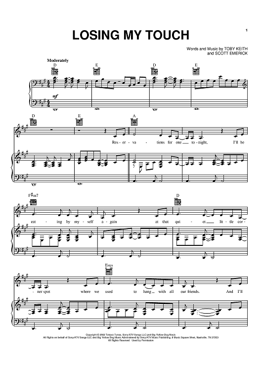 Digital Sheet Music for Losing My Touch by Scott Emerick, Toby Keith scored for Piano/Vocal/Chords; id:370881