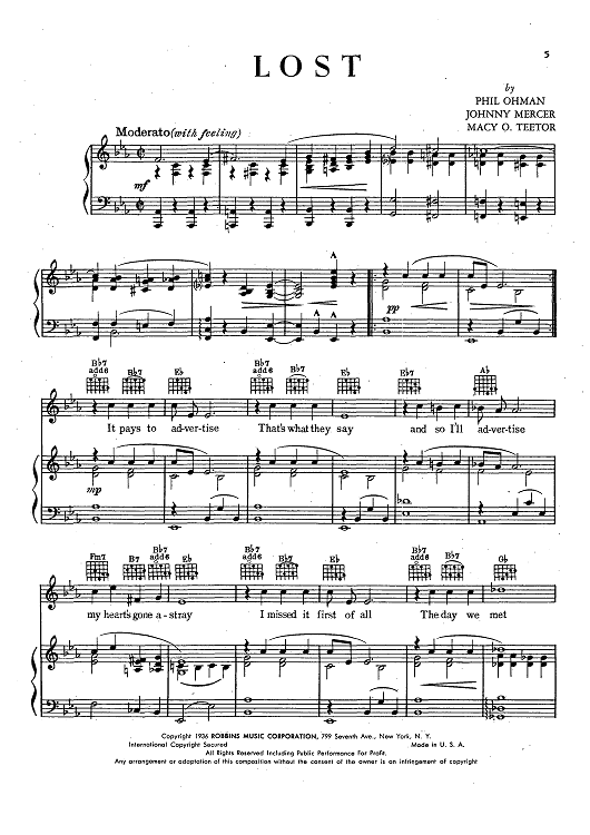 Digital Sheet Music for Lost by Johnny Mercer, Macy O. Teetor, Phil Ohman, Barry Wood scored for Piano/Vocal/Chords; id:423036