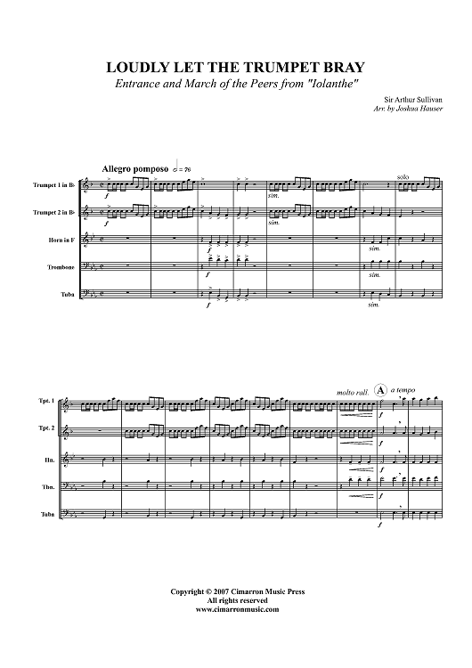 Digital Sheet Music for Loudly Let the Trumpet Bray (Entrance and March of the Peers from "Iolanthe") - Score by Arthur Sullivan, Joshua Hauser scored for Brass Quintet; id:364637