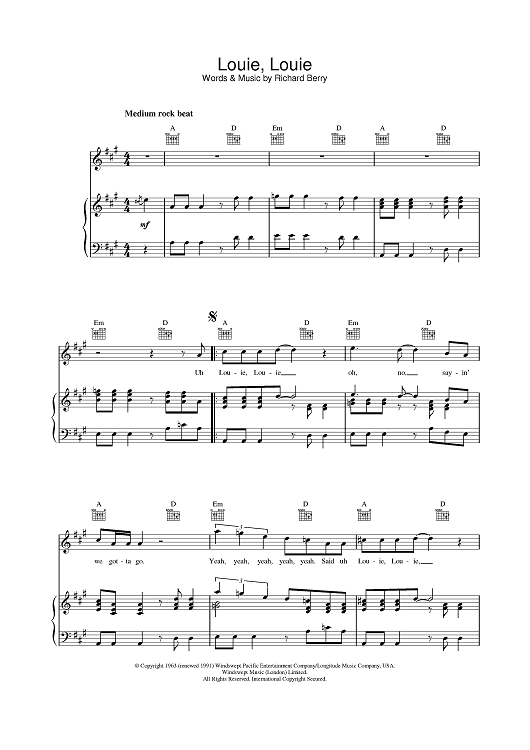 Digital Sheet Music for Louie, Louie by Richard Berry, The Kingsmen scored for Piano/Vocal/Chords; id:377063