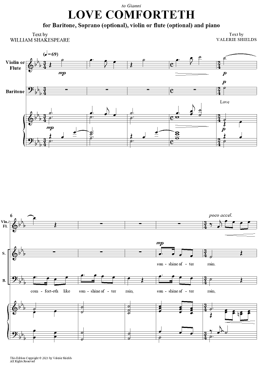 Digital Sheet Music for Love Comforteth by William Shakespeare, Valerie Shields scored for Baritone, soprano (opt.), Violin or flute/Piano; id:468928