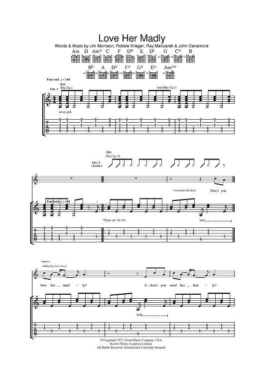 Digital Sheet Music for Love Her Madly by The Doors, Jim Morrison, Robbie Krieger, John Densmore, Ray Manzarek scored for Guitar Tab; id:392119