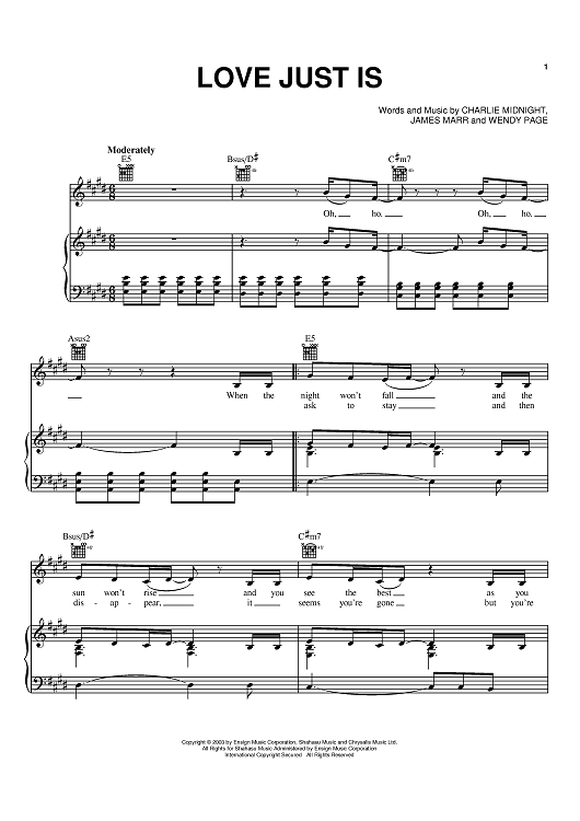 Digital Sheet Music for Love Just Is by Charlie Midnight, James Marr, Wendy Page, Hilary Duff scored for Piano/Vocal/Chords; id:373535