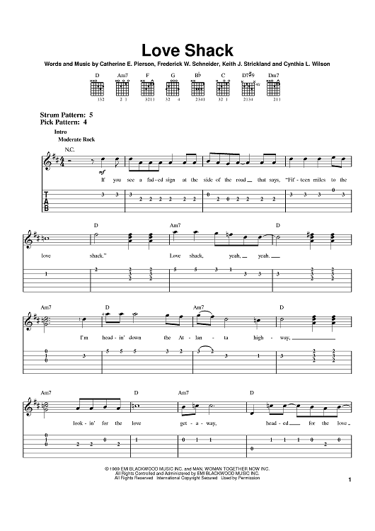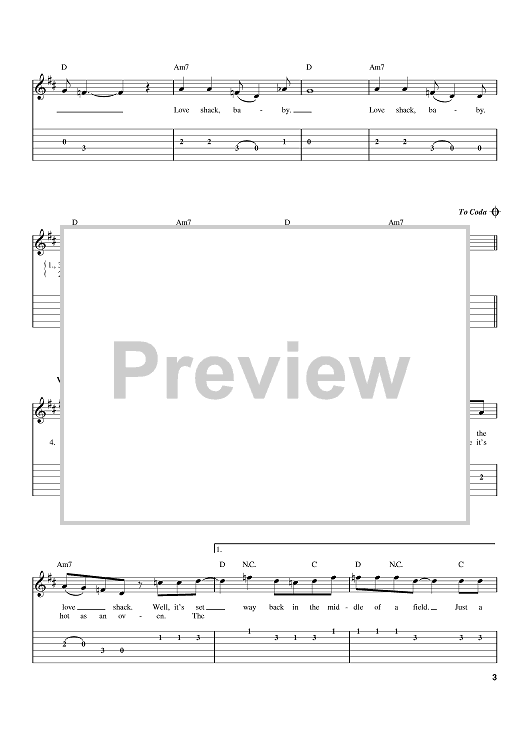 Digital Sheet Music for Love Shack by The B-52's, Catherine E. Pierson, Frederuck W. Schneider, Keith J. Strickland, Cynthia L. Wilson scored for Easy Guitar Tab; id:387960